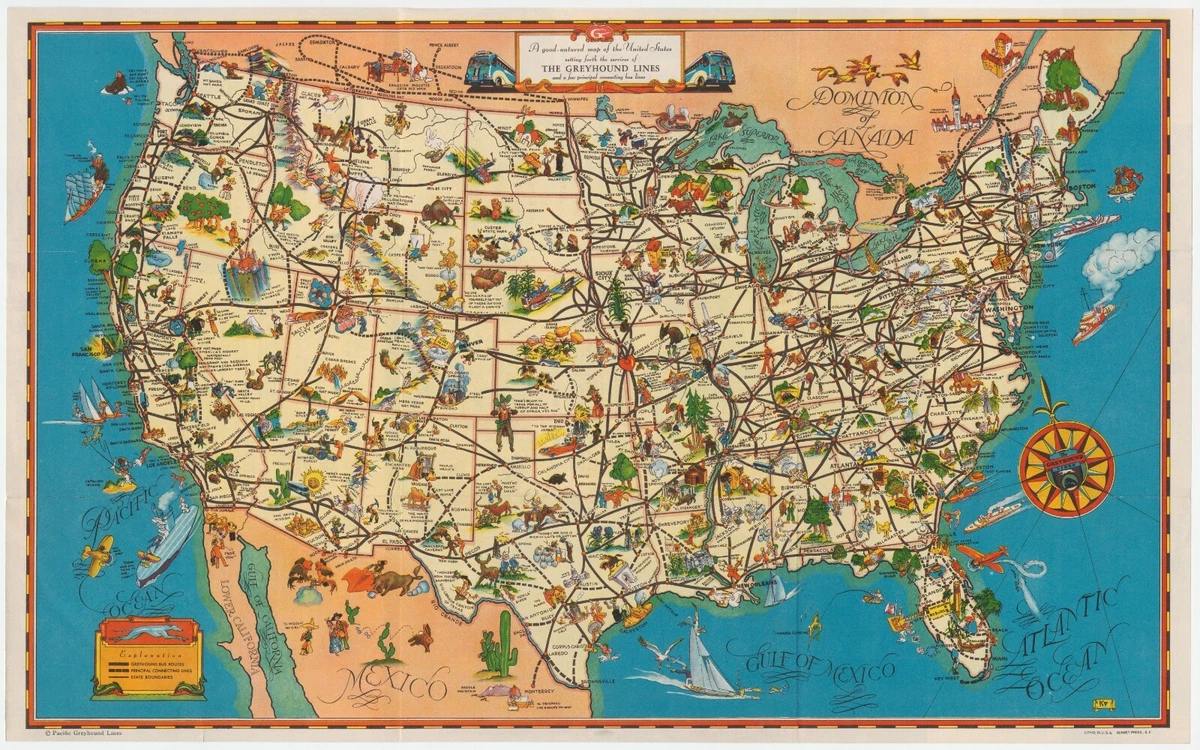 Greyhound Lines United States Transit Map c. 1950’s folding travel